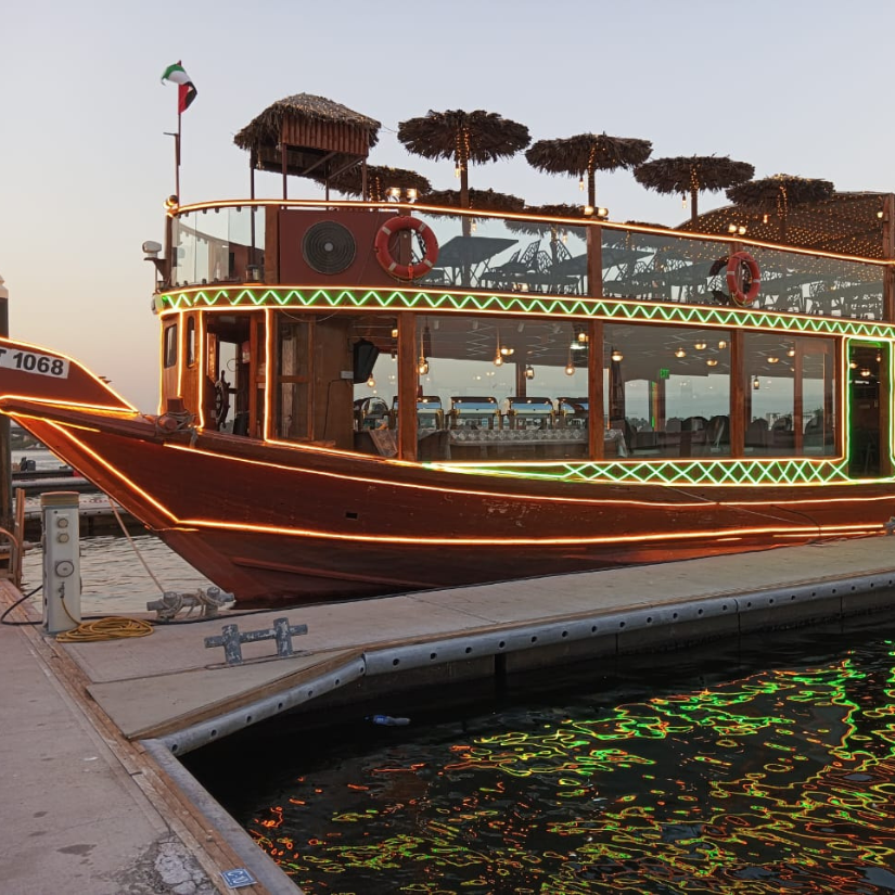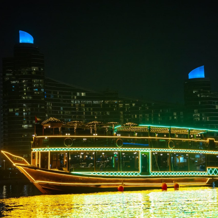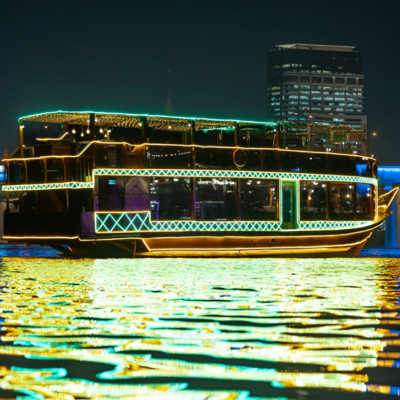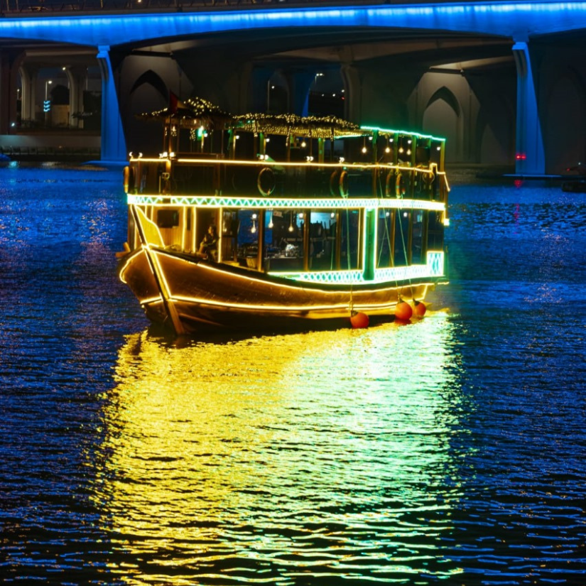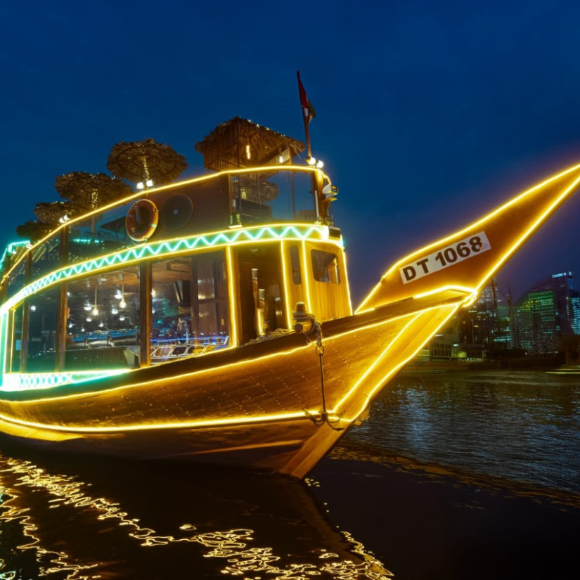 Step aboard a traditional dhow and sail through the historic heart of Dubai Creek. This charming cruise blends the cityβs rich cultural heritage with a cozy evening under the stars. Glide past iconic souks, heritage buildings, and wooden abras as you enjoy a relaxing 2-hour cruise. Savor a delicious international buffet, live entertainment shows, and warm Arabian hospitality β all while soaking in the romantic ambience of Old Dubaiβs shimmering waters